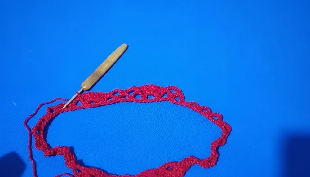 • Form small arches: Chain 5, skip 1, single crochet (sc) in the third chain from hook, chain 5, skip 2, sc in 3rd chain — repeat forming eight 5-chain arches around.