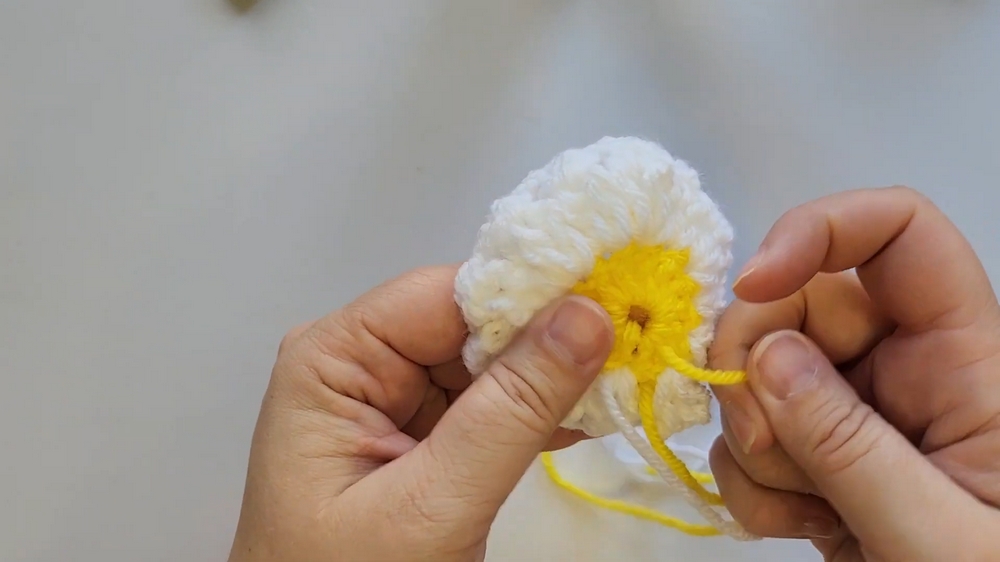 - At the end of the round, connect to the first stitch and fasten off your yarn.
