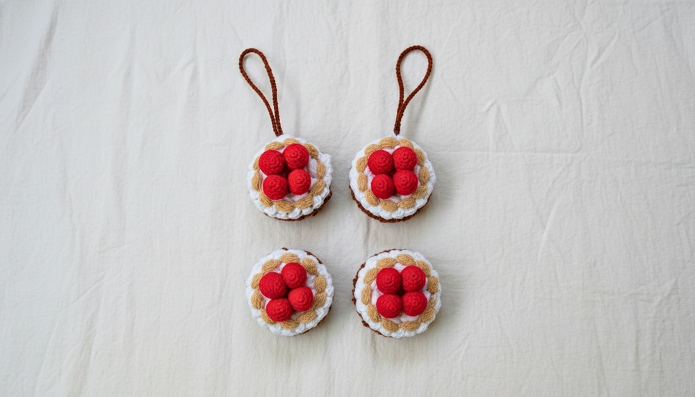 • Yarn: Multiple colors are used, including red for the strawberry base, cream or white for the topping, and green for the ruffles.