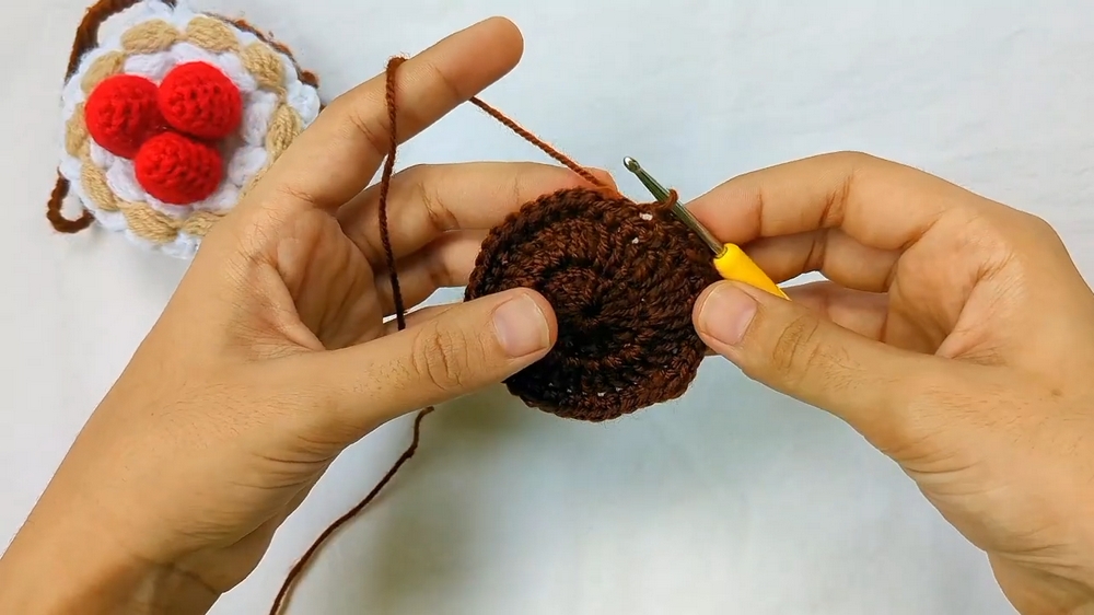 2. Continue rounds by increasing single crochets according to the pattern to shape the strawberry.