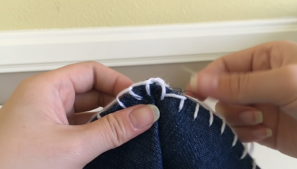- Sew Base Stitches: Thread your needle with yarn, tie a knot at the end, and begin sewing base loops around the denim following the markings.