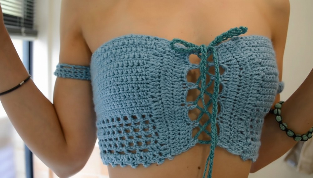You have now completed the beautiful off-the-shoulder summer top! The detailing, including the side laces and decorative edges, makes it the perfect summer accessory. Try different yarn colors to customize the look further.