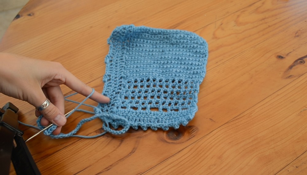 - DC in the next ST, CH 2, SK 2 STS, repeat this DC, CH 2, SK 2 to complete the row.