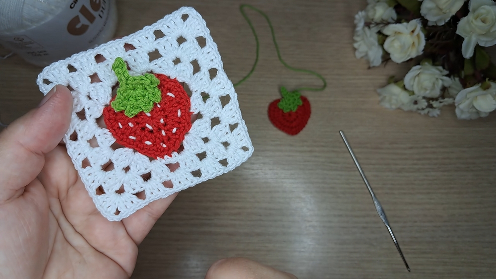 - For the strawberry applique, leave extra yarn to sew the stem onto the square and create embroidered white dots for added detail.