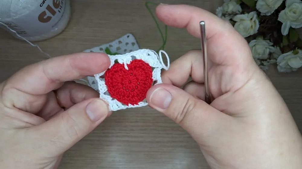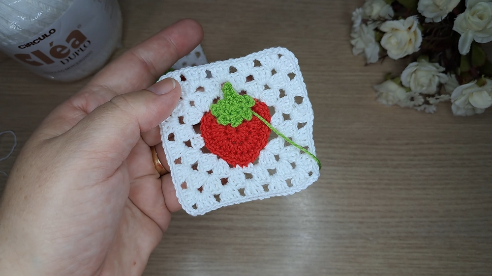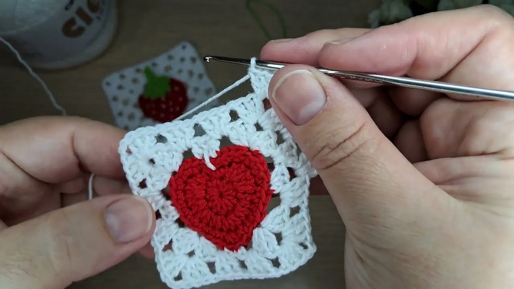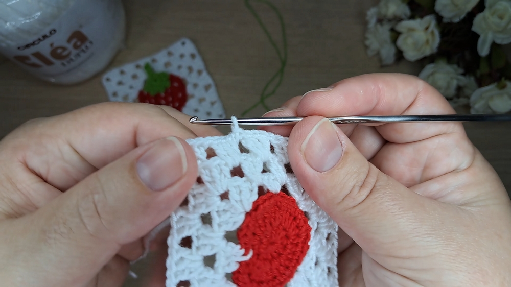 - Move to the sides of the strawberry, continue crocheting with fans and double crochets in intervals to shape the square while maintaining the strawberry at the center.