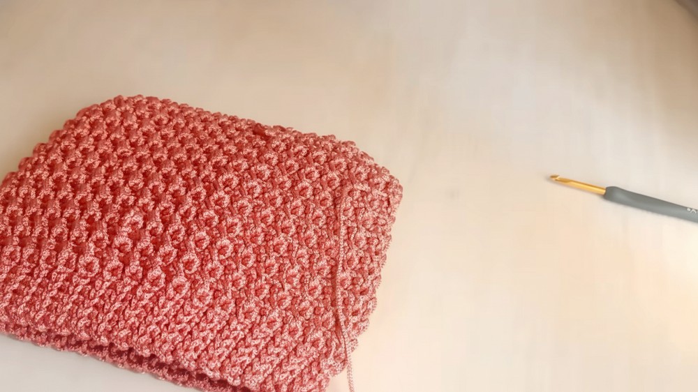 - After the 37th row, turn the bag inside out, fasten off with a meter-long thread to prepare for sewing.