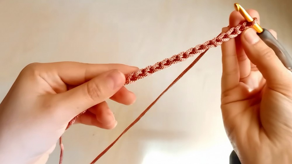 - Repeat the pattern of one hdc and one sl st until the last two chains.
