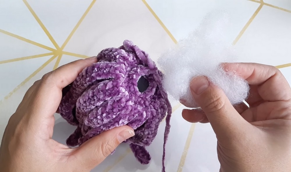 A noticeable touch is the positioning of safety eyes along Rows 17 and 18, ensuring an expressive and fitting look to the squid’s face. All the while, stuffing is carefully added to maintain its plush form.