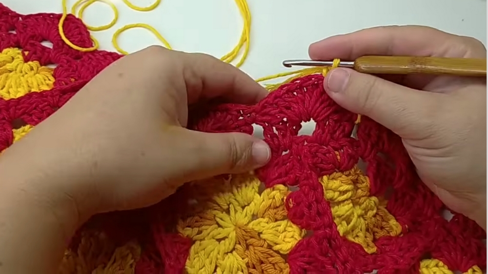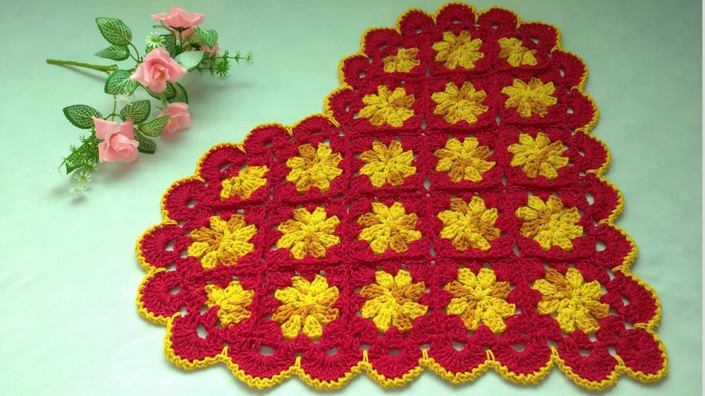 At the foundation of this mosaic rug lies a thoughtful combination of whole and half-square crochet blocks. Beginning with nine full squares arranged symmetrically, the process gradually transitions into heart-shaped detailing by merging half squares and adding carefully aligned stitches.