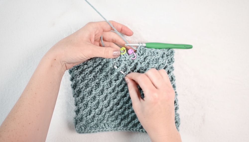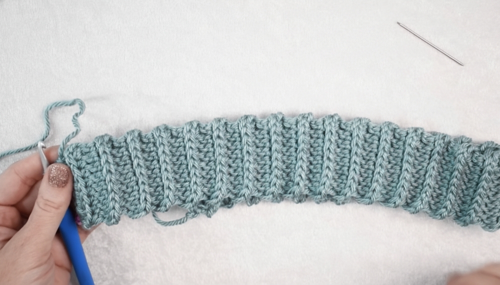 - Work stitches carefully into the third loop of the half double crochet to achieve the band’s ribbed effect.