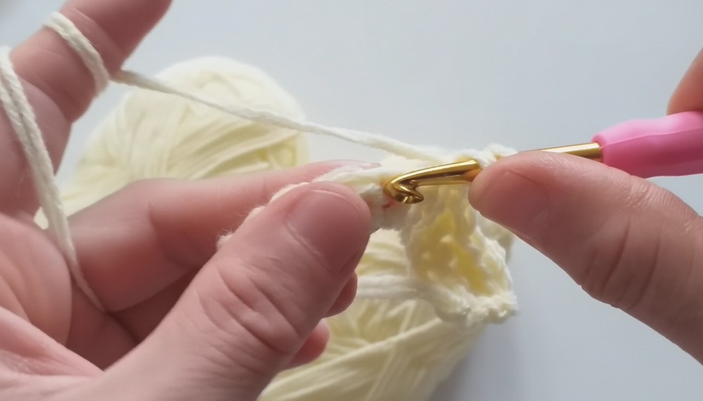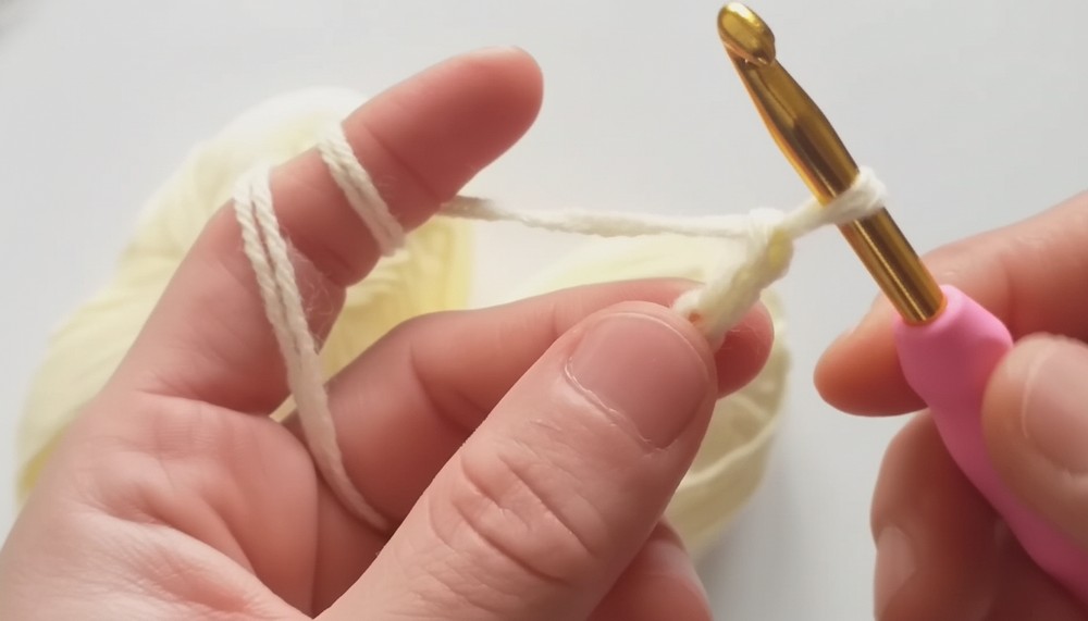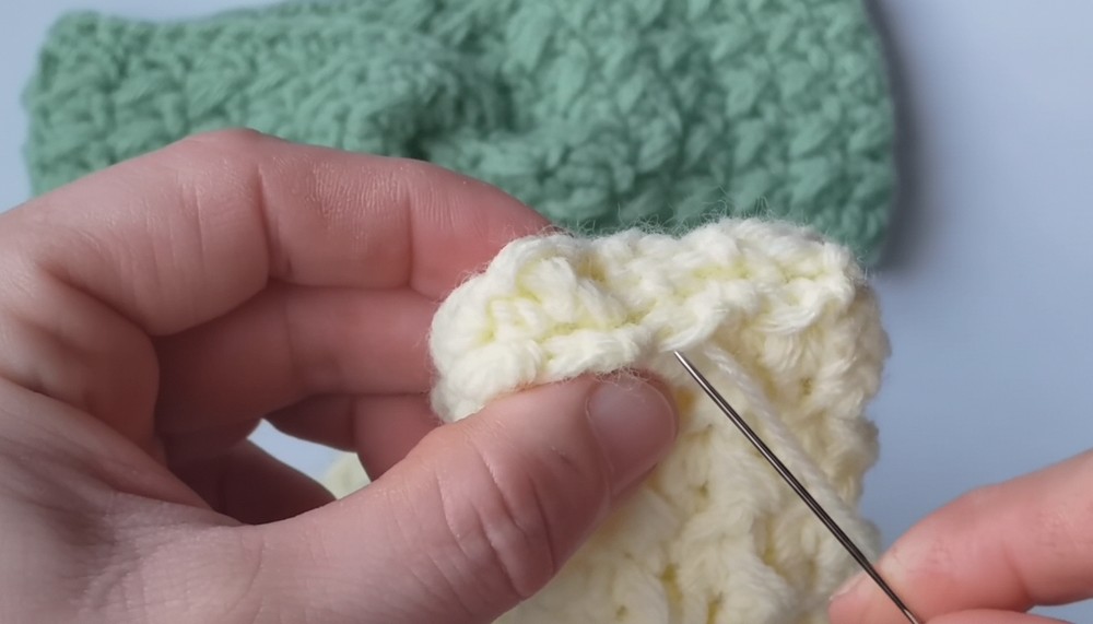 Materials: You will use soft, fine-textured baby yarn and hold two strands together to achieve a thick, soft texture. You also need a large 6 mm crochet hook and a darning needle for seaming.