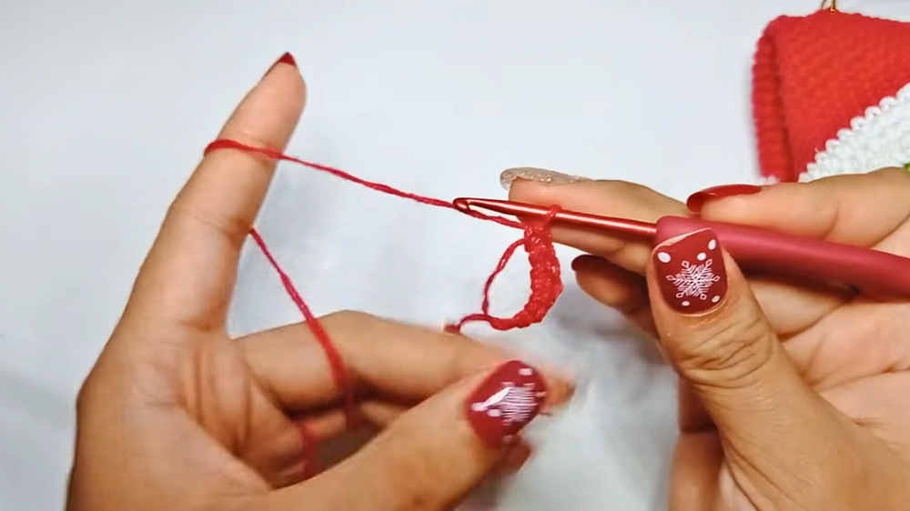 - Beginning at Round 30, switch to white yarn to create the trim of the Santa hat.
