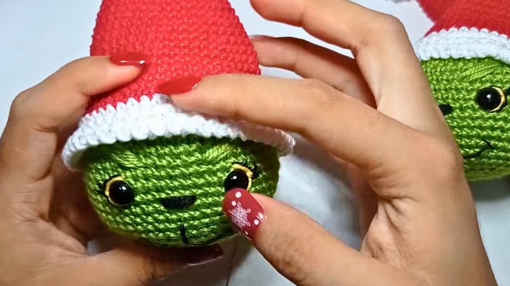 - Mark the center of the face, two rows below the nose. Use black yarn to carefully embroider the Grinch’s signature sly smile.