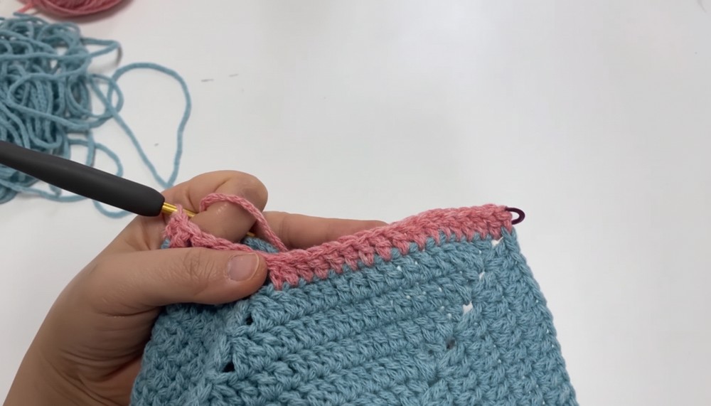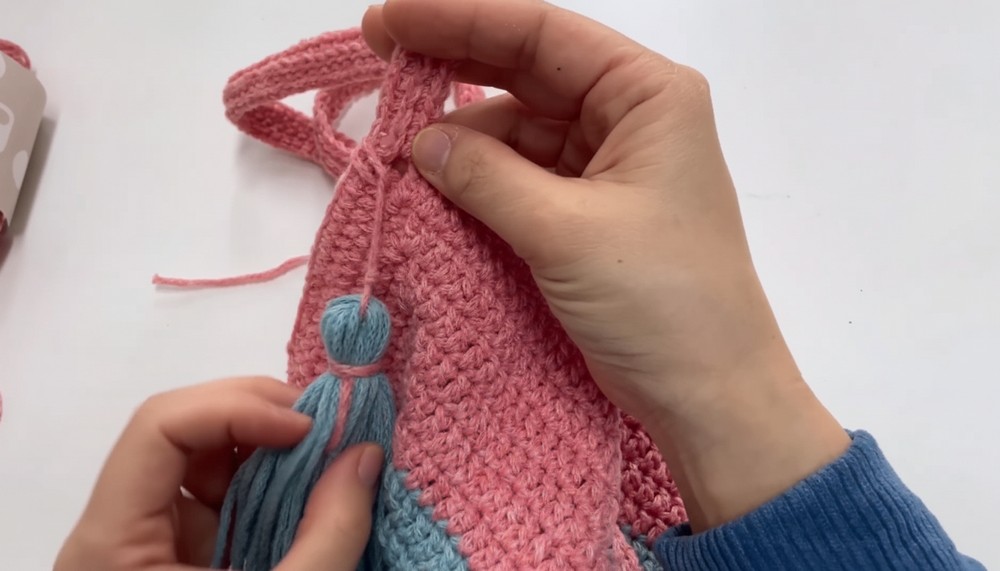 Check Tension on Handle: When you crochet the long chain for the handle, use a relaxed tension. Crocheting too tightly will make it extremely difficult to work single crochet stitches back into the chain loops later.