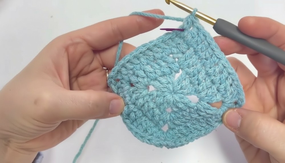 Shaping with Decreases: You maintain the square-building increases (2 DC, Chain 2, 2 DC) at the four corners while simultaneously performing decreases (DC DEC) in the center of each side. This combination allows the piece to grow outwards at the corners and fold inwards at the sides, forming the three-dimensional bag body.