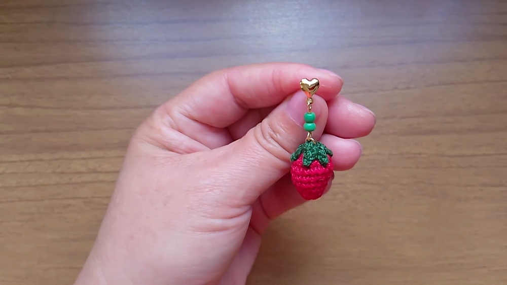 - Attach the completed strawberry piece to the earring hooks, allowing it to swing freely.